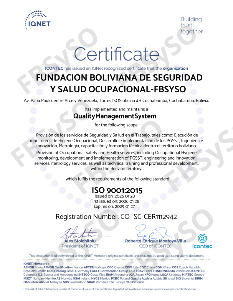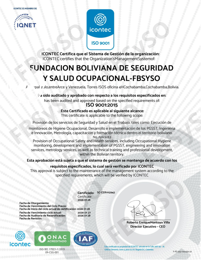 En FBSySO contamos con la certificación ISO 9001:2015, otorgada por ICONTEC y reconocida por IQNet, que respalda la implementación y mantenimiento de un Sistema de Gestión de la Calidad orientado a la mejora continua. Esta certificación fortalece nuestro compromiso de brindar servicios consistentes y confiables en Seguridad y Salud en el Trabajo, incluyendo monitoreos de Higiene Ocupacional, desarrollo e implementación de PG-SST, metrología, capacitación y formación técnica en el territorio boliviano.
